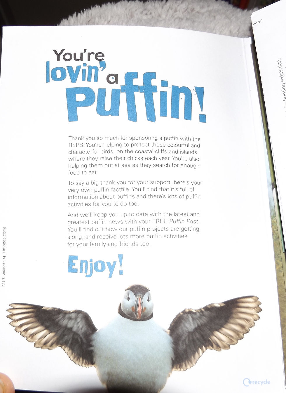 I am now the proud sponsor of a puffin! The RSPB offer the opportunity to anyone to sponsor a puffin for £3 a month, and this money goes towards the preservation of known popular breeding areas for puffins and helping to maintain rat-free areas for the puffins to nest and start new families. Life as a puffin sure isn’t easy, and it’s actually a lot more of a tricky life than I initially knew. Atlantic puffins are actually now registered as an endangered bird, with puffins facing the same level of extinction as the african elephant and lion, and more endangered than the humpback whale. The reason for this is a combination of limited food sources and puffin chicks (or pufflings as they are more adorably sometimes called) being killed/eaten by rats inhabiting puffin nesting areas. Puffins mate for life, meeting up with their puffin partner in the same location every year to mate and produce offspring, but with only one egg per puffin pair a year, if this puffling doesn’t survive then the pair have to wait until the next year to try again. Puffins make their nests on the ground, either a burrow dug into the ground or amongst rocks. This is why the nests are so easily accessible by rats. However, when (hopefully) the egg hatches and a puffling is born (and is not eaten by nasty bad guy rats), then both parents take it in turns to find food for their new baby, which needs feeding up to seven times a day. Puffins primarily eat small fish such as sandeels and other similar fish, but due to climate change and warmer seas, these fish are less plentiful and the puffins have to travel further and further to find food. Puffins spend the majority of their lives out on the open ocean, either flying or floating over the vast seas. Once a year, they all congregate back to their native lands to find their puffin partner, in order to mate and breed. The mysterious thing about puffins though, is that scientists have yet to work out how they navigate. However, it isn’t all doom and gloom being a puffin, they are extremely social creatures and form massive colonies, the largest known being a colony of 4 million puffins! They have many intricate body languages that communicate different emotions and signals to their fellow puffins, such as tucking their beak to their chests and moving past another puffin's burrow to demonstrate that they are passive, or puffing (puffin-g...is there a hidden pun there perhaps?) out their chests, spreading their wings, stamping its feet and opening its beak to look fearsome and frightening. They can also reach incredible flying speeds of up to 55mph, their wings beating up to 400 times a minute. The life span of a puffin is usually around 20 years, which is a lot longer than I had originally thought!